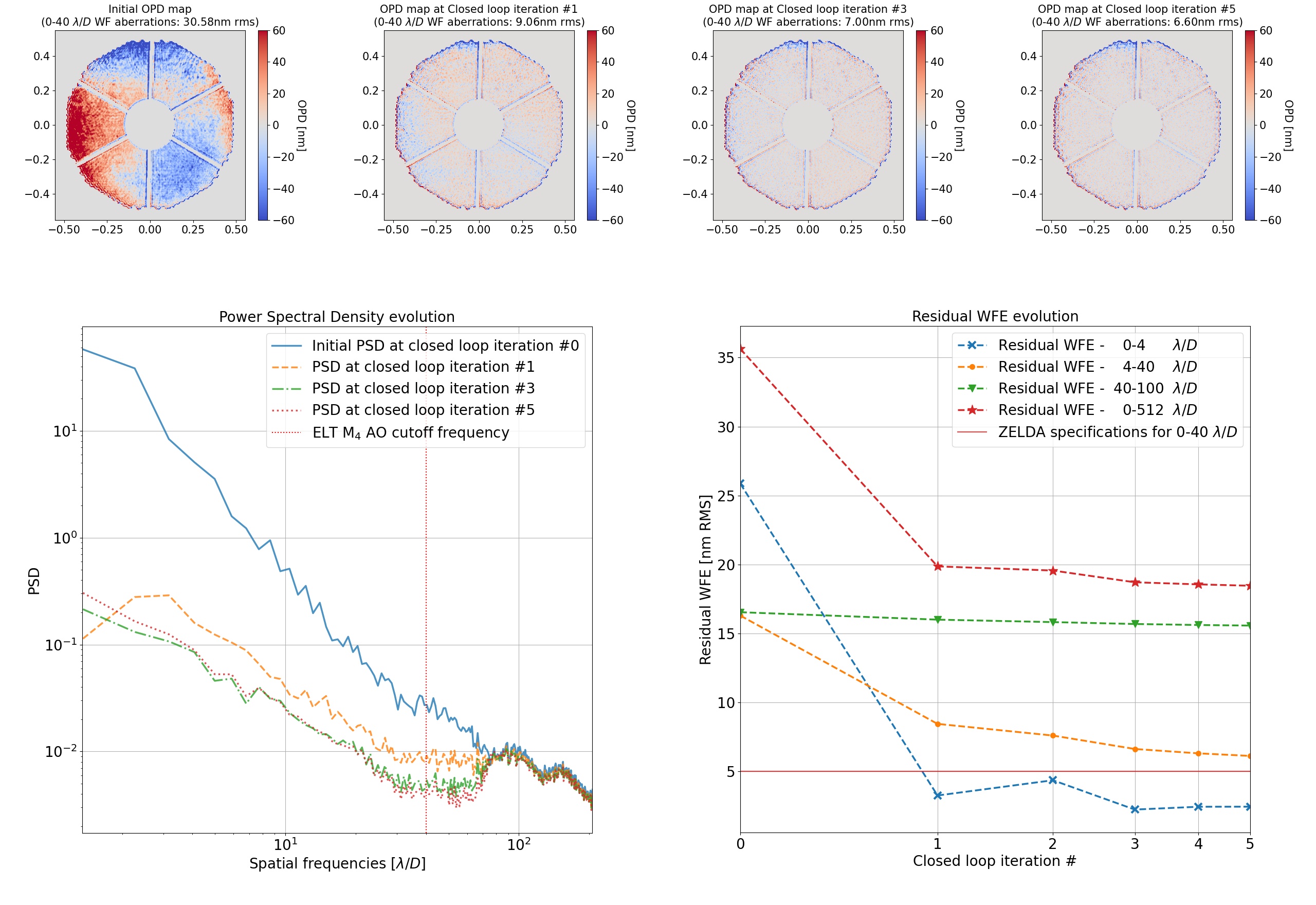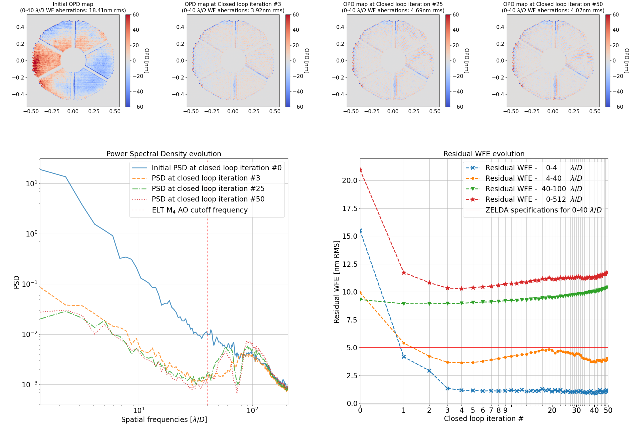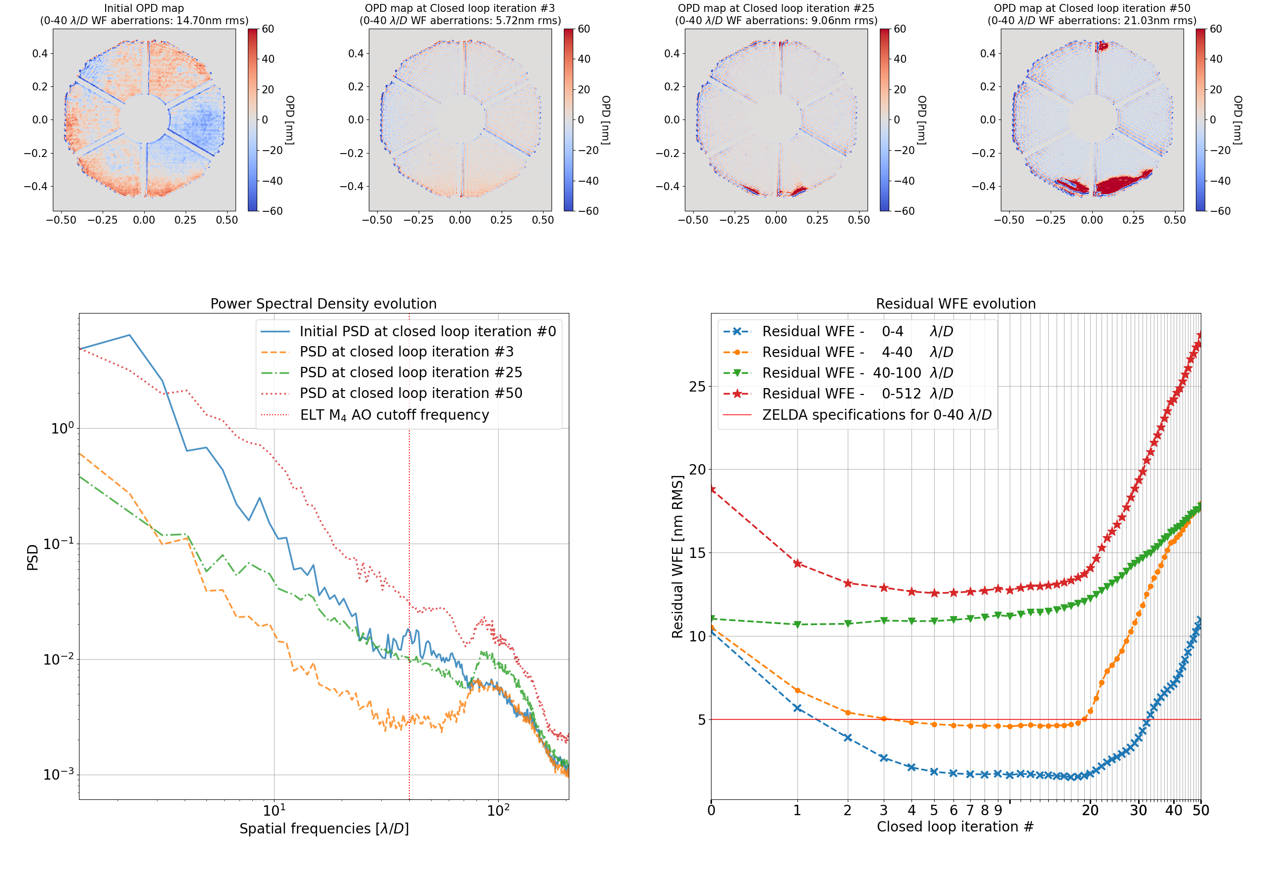 Figure 4: Evolution of the ZELDA signature, wavefront error residuals and PSD when closing a loop in the ideal case (neither dispersion nor AO residuals). Image source: “HARMONI at ELT: A Zernike wavefront sensor for the high-contrast module – Testbed results with realistic observation conditions” (SPIE Proceedings, 2022)