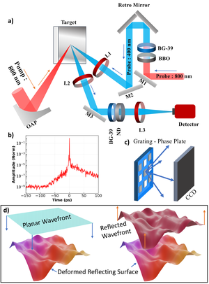 Figure 1: a) Experimental setup showing spatial and temporal alignment of the pump and probe beams on the target. b) Temporal contrast measurement of the laser. c) Diagram of the QWLSI wavefront sensor. d) The reflected wavefront contains information about the evolving plasma surface.