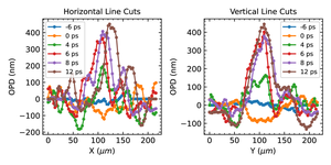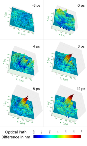 Figure 3 : Measured wavefront at different time delay between pump and probe. Initially near T0 (i.e. pump-probe delay 0 ps), the plasma is pushed inside and at later times, the plasma expands towards the vacuum due to the thermal expansion.