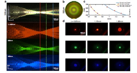 Figure 1 (a) Using red (625 nm), green (530 nm), and blue (455 nm) LEDs, the longitudinal scan shows distinct focal positions: red focuses near 0.95 mm, green at 1.15 mm, and blue at 1.35 mm, with a weak secondary focus for blue and green at 0.5 mm. (b) Microscope image of the metalens surface morphology. (c) Measured focal length versus wavelength, in good agreement with the theoretical λ/πr² = z relation. (d) Two-dimensional point-spread functions (PSFs) for RGB channels measured on a standard microscope. Image source: Light: Science & Applications, “Quantitative phase imaging endoscopy with a metalens.”
