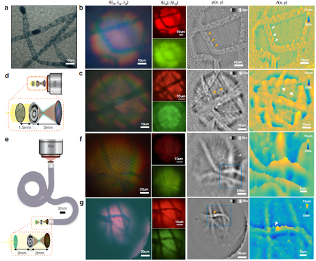 To further test real-world feasibility, the team mounted the metalens directly at the tip of a coherent fiber bundle (CFB). In typical conditions, fiber bundles disrupt spatial phase coherence, making QPI extremely difficult. In this configuration, however, the phase information was pre-encoded into intensity through the chromatic defocus among RGB channels. As a result, the phase could still be faithfully recovered after transmission through the fiber bundle.