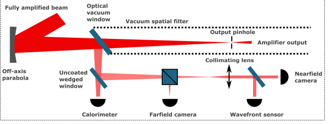 A small diagnostic portion of the amplified beam was extracted through a vacuum window, attenuated, and then split into several channels to measure the beam profile, pulse energy, and wavefront at the same time. This layout limited additional aberrations from downstream relay optics and ensured accurate wavefront retrieval.
