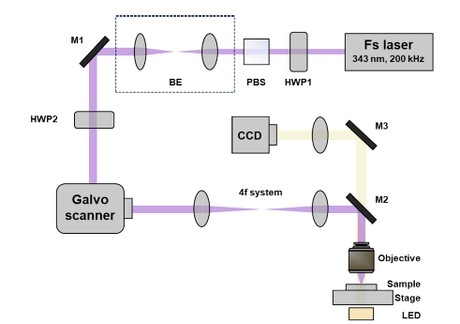 Figure 1. UV femtosecond laser writing setup Image source: Figures adapted from Optics Express, Vol. 32, No. 26, 46140–46156 (2024).