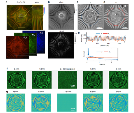 (g) A spectral stack computed from a single color image matches the experimental defocus images, validating the accuracy of the phase reconstruction.