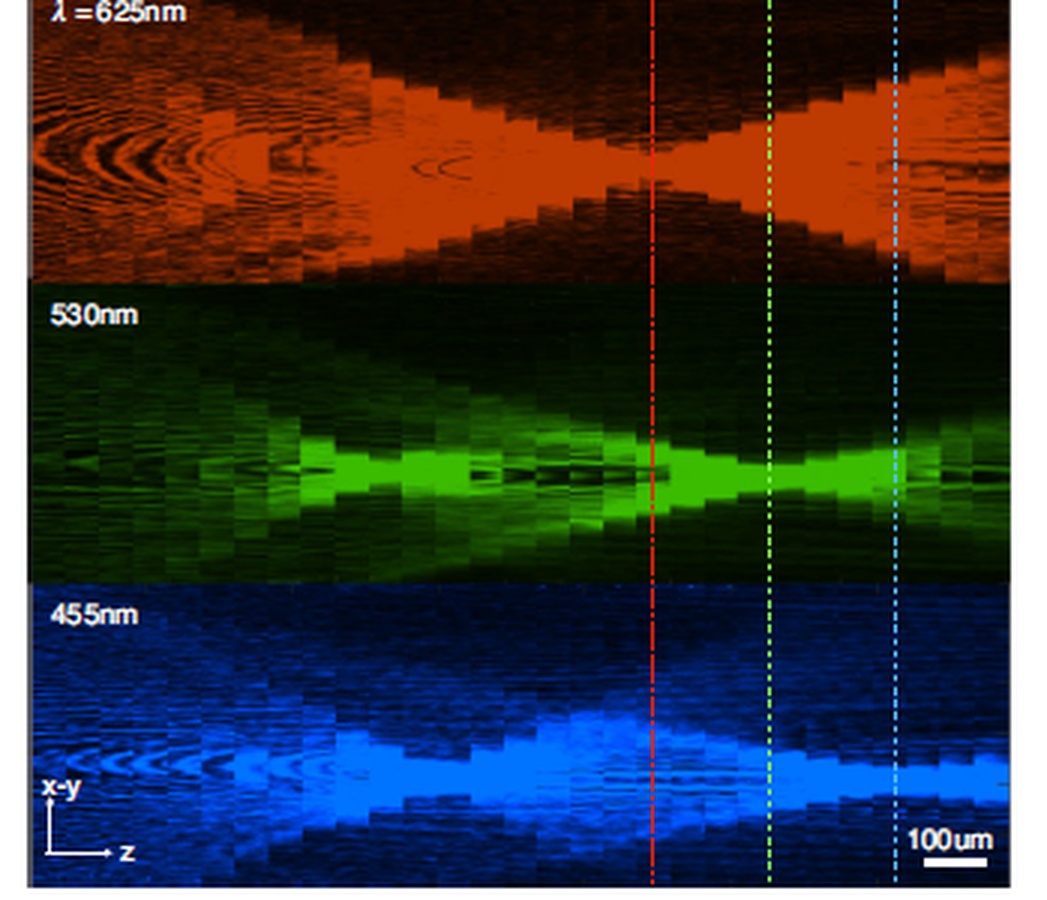 Figure 1 (a) Using red (625 nm), green (530 nm), and blue (455 nm) LEDs, the longitudinal scan shows distinct focal positions: red focuses near 0.95 mm, green at 1.15 mm, and blue at 1.35 mm, with a weak secondary focus for blue and green at 0.5 mm. (b) Microscope image of the metalens surface morphology. (c) Measured focal length versus wavelength, in good agreement with the theoretical λ/πr² = z relation. (d) Two-dimensional point-spread functions (PSFs) for RGB channels measured on a standard microscope. Image source: Light: Science & Applications, “Quantitative phase imaging endoscopy with a metalens.”