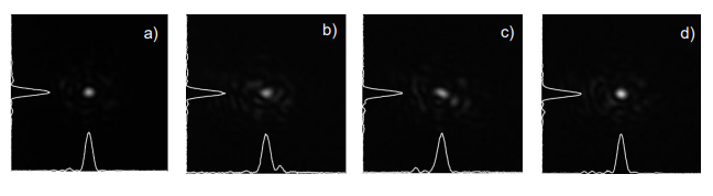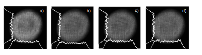 Figure 7. Top: Spatial profiles in nearfield for cold state(above)/ of focused beam for cold state(below) (a) and a sequence of three consecutive shots (b, c, d) from the 1 / 2 min repetition rate measurement. Image credit: THRILL Project Report (ELI Beamlines, 2024).