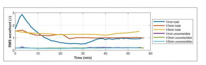 Wavefront evolution was evaluated using orthogonal mode decomposition to separate slow low order thermal distortions from higher order residual structure. Low order terms, mainly arising from alignment drift and environmental fluctuations, were effectively reduced by the AO loop, while the remaining high order components defined the steady state wavefront.
