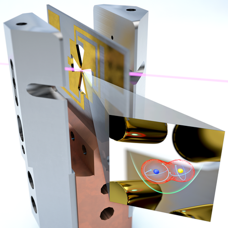 Figure 1: The NIST Quantum Logic Optical Clock is a premier type of optical clock and currently one of the most precise timing systems in existence. The image shows its core component : the ion trap (gold structure with a cross-shaped aperture) used to stably confine the ions. The inset visualizes the aluminum ion (blue), which provides the clock's "ticking" reference, co-trapped with a magnesium ion (yellow) used for sympathetic cooling and quantum logic readout. Image Credit: S. Burrows / JILA