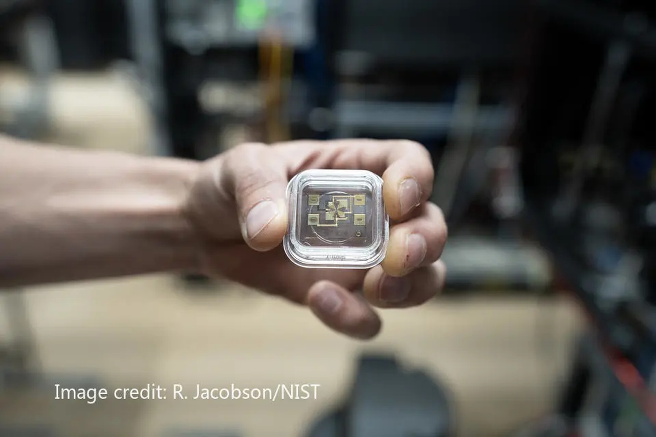 Figure 2: A NIST physicist holds the newly improved ion trap for the Aluminum-ion clock. Image Source: R. Jacobson / NIST
